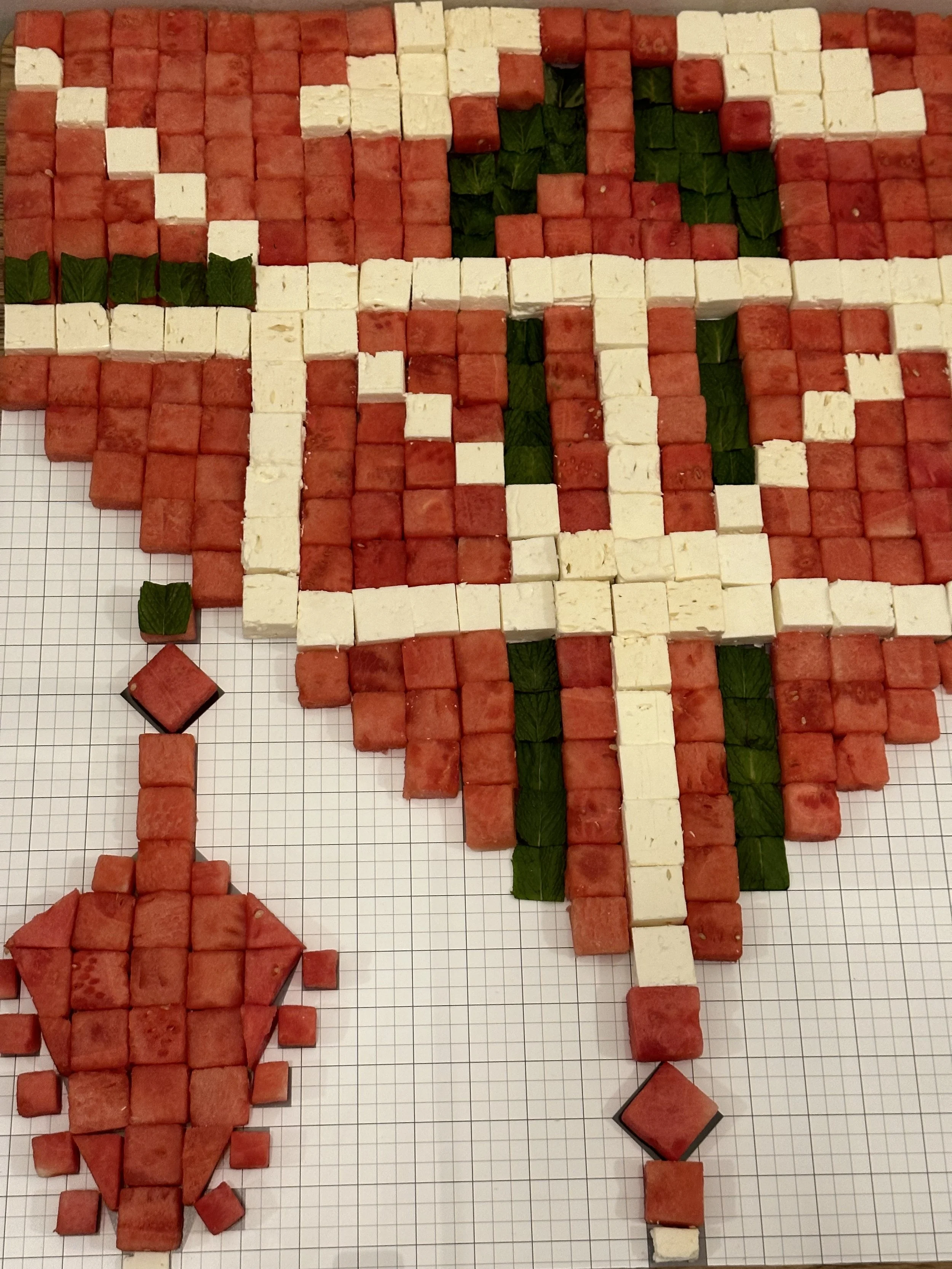 Mise en Place and Co. enhanced the space with a custom food art installation made out of watermelon, feta, and mint. This watermelon tatreez design was inspired by traditional Palestinian embroidery dating back to 3,000 years ago. This ancient embroidery practice is how women preserve their culture in which patterns can vary from town to town! Mise En Place and Co’s watermelon tatreez installation was dedicated to Gaza.